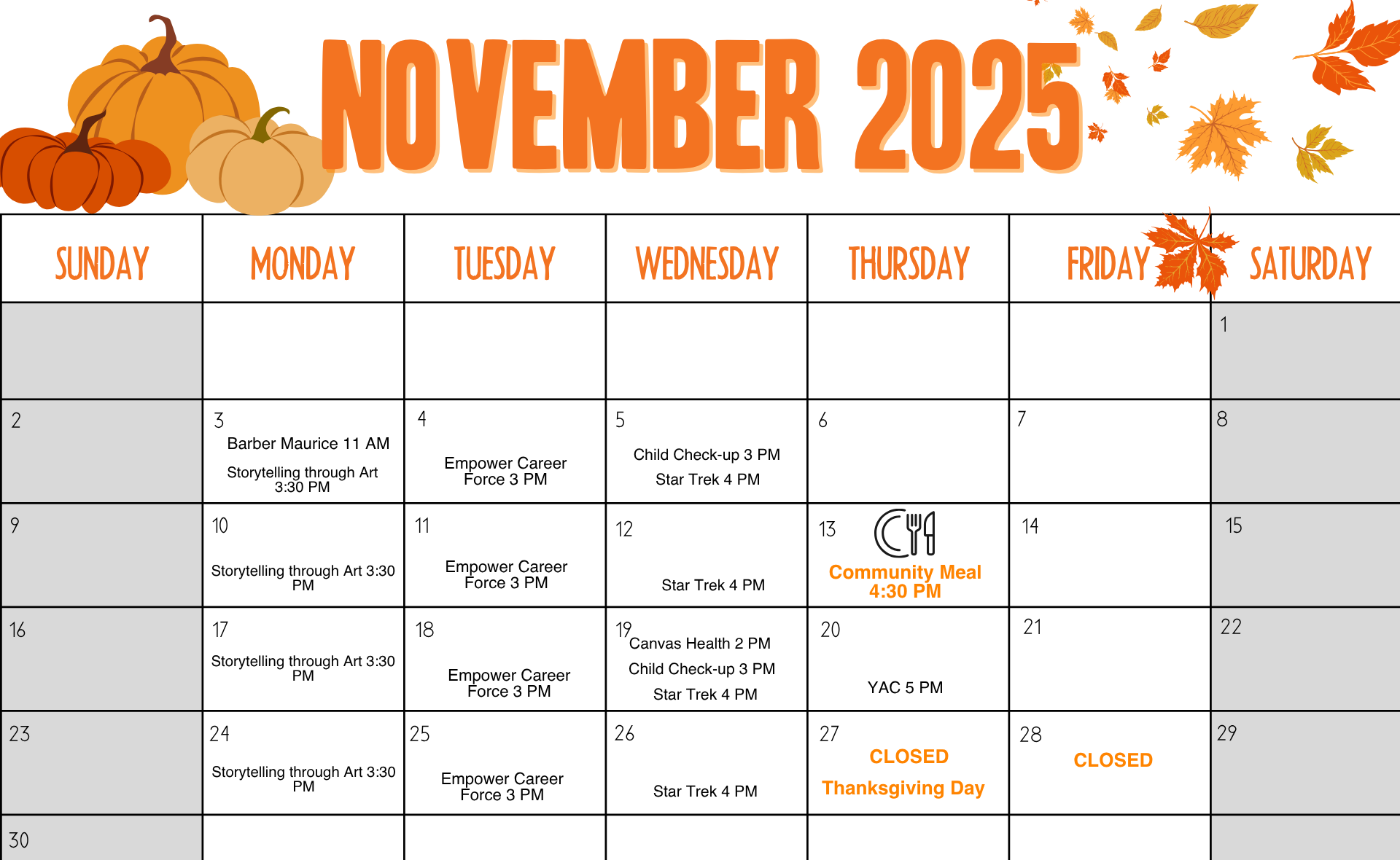Meals are served Monday-Thursday from 4:30 pm to 5:30 pm!