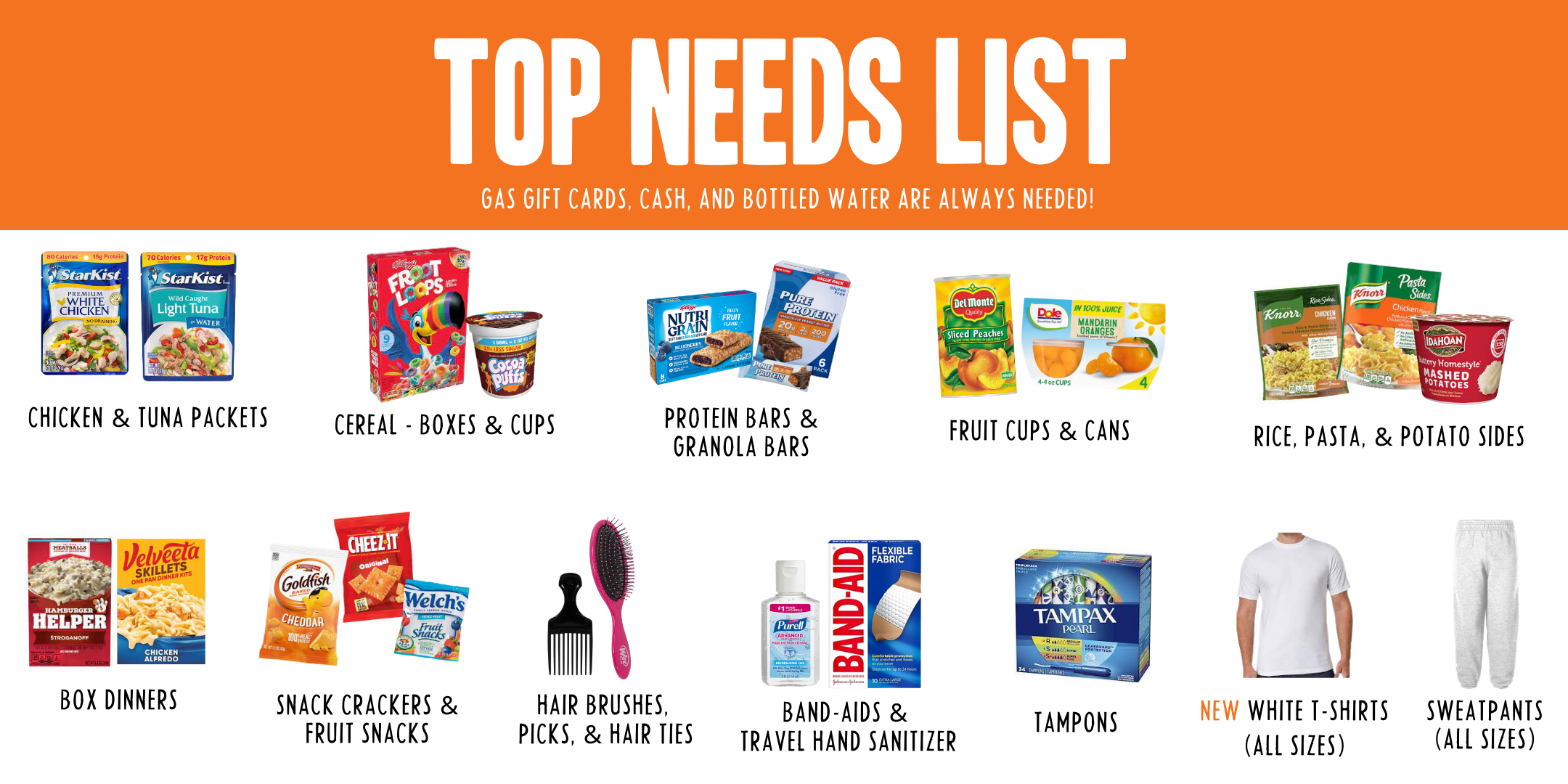 Our top needs list focuses on the most important items needed to fill our HOPE 4 Youth Center pantry and clothing closet. Gas gift cards, cash, and bottled water are always needed items. *UPDATED MARCH 2026*